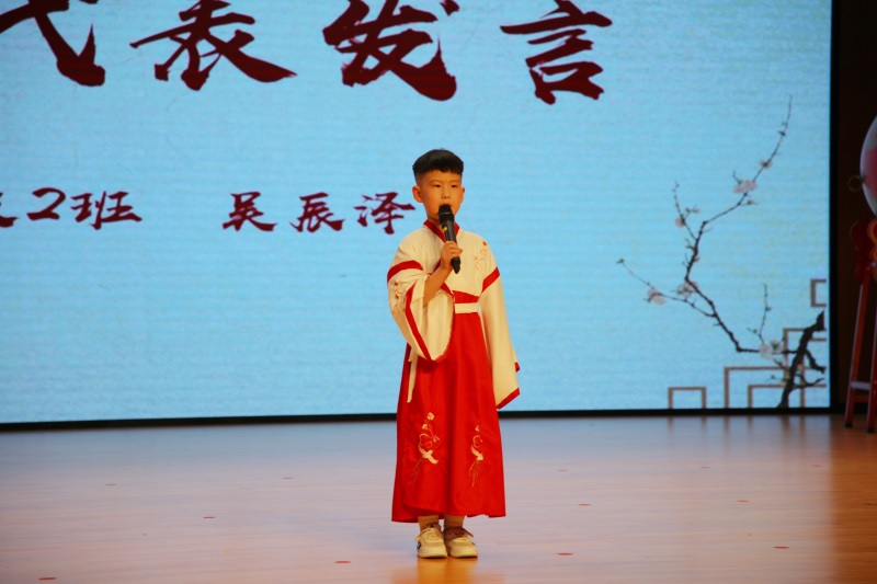 一年级2班吴辰泽同学代表全体小2023级新生发言:“我将会和所有一年级新生一起好好学习,健康成长,努力做一个全面发展的好学生。”