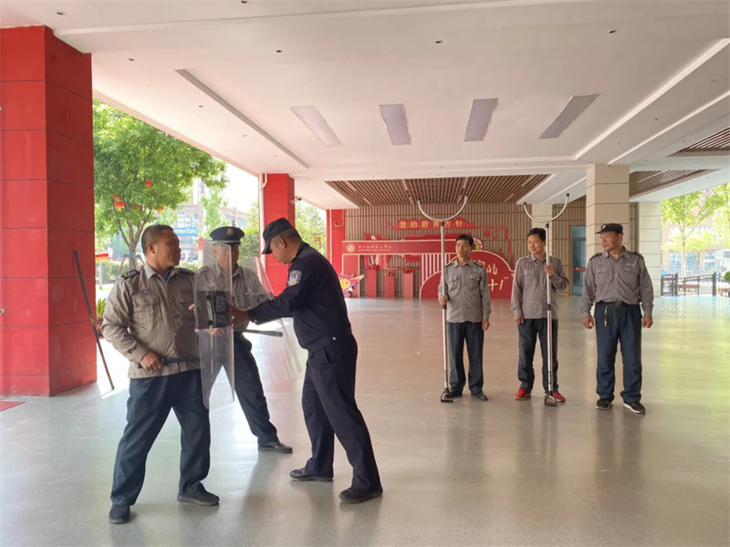 演练之前,同文路派出所驻校民警对全体安保人员进行了防暴技能培训,对安保装备的用法、校园巡逻守护及突发事件紧急处置进行详细讲解,使全体安保人员准确熟练掌握各种安保器械的使用要领。