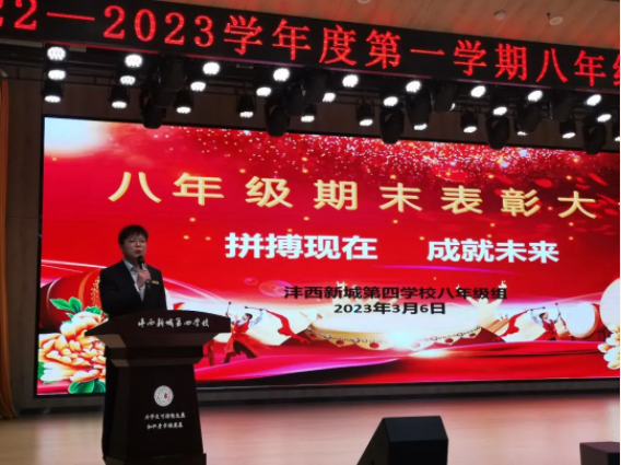 “长风破浪会有时,直挂云帆济沧海。”时光荏苒,岁月匆匆,转眼之间紧张又忙碌的八年级第一学期的学习生活已经结束,八年级第二学期也已经悄然而至。回首八年级已流逝的这段岁月,同学们既有成长的酸甜苦辣,又有收获时的心花怒放。为了总结各班、各位同学这段时间以来在学校各方面的表现,表彰这段时间以来通过自身努力、刻苦学习,在各方面取得的优秀成绩的同学,八年级组在这春光明媚的时节召开了2022-2023学年八年级学生成果表彰大会。参加此次表彰大会的领导有沣西新城第四学校执行校长余爱东,沣西新城第四学校校办主任兼政教主任付亮。