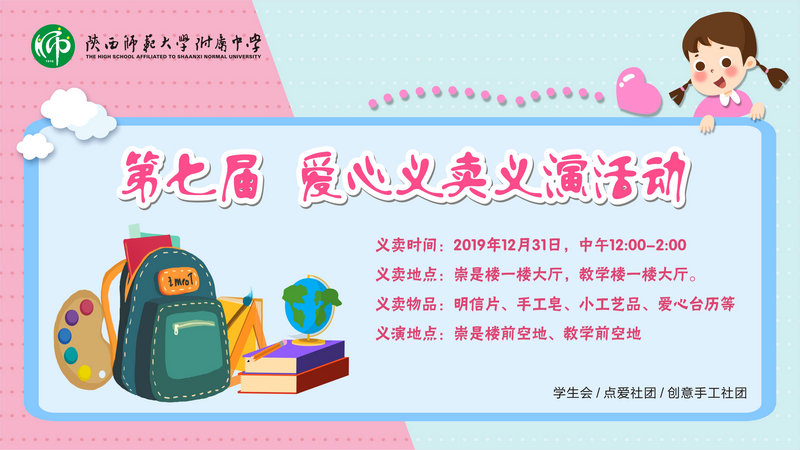 为进一步培养我校学生乐于助人的品质、增强大家对残障儿童的了解与关注并加入志愿服务活动,我校学生会携点爱社、创意手工社于2019年12月31日在教学楼与崇是楼一层大厅举办了第七届爱心义卖、义演活动。