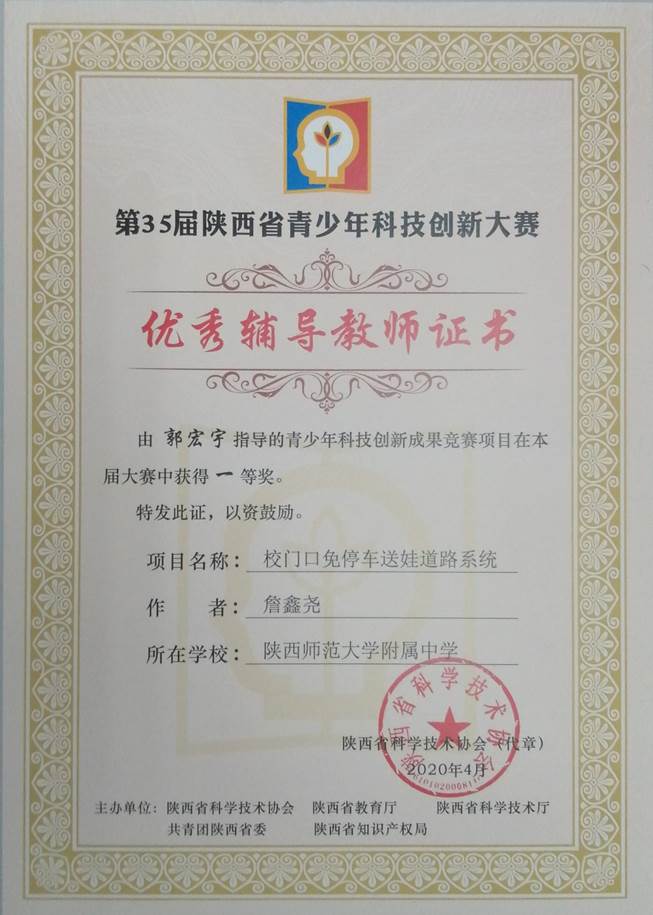 郭宏宇老师 获得陕西省青少年科技创新大赛优秀辅导教师;