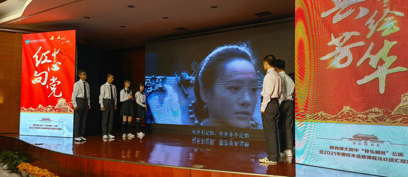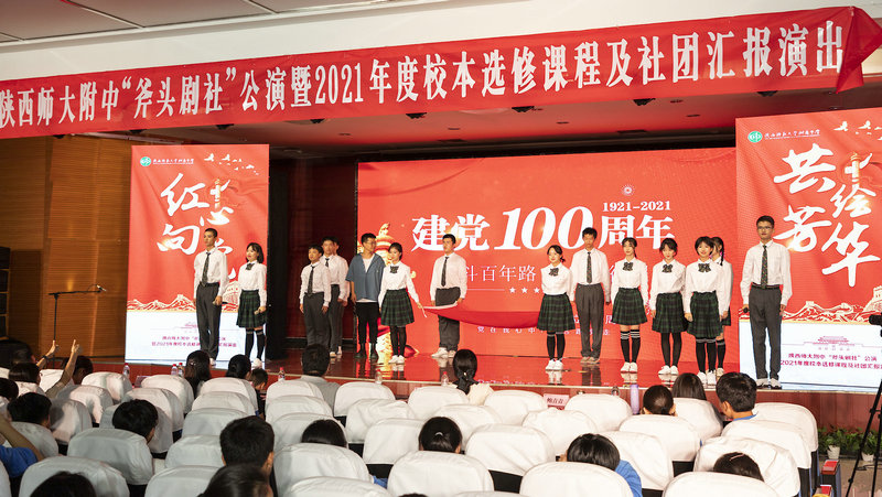 为庆祝中国共产党成立100周年,全面展示我校丰富多彩的校园文化生活,彰显五育并举的育人成果, 6月16日下午,学校在崇文楼报告厅举行了红心向党·共绘芳华——陕西师大附中“斧头剧社”公演暨2021年度校本选修课程及社团汇报演出活动。我校副校长高丽文、教研室主任董翼、政教处副主任鲍青青、符洁,非毕业年级组长、“斧头剧社”指导教师杨梅、部分校本选修课程及社团师生代表参加了此次活动。