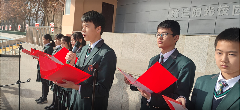 活动的领读者初二年级吴依晨、马宋嘉颖、史子鹤、马煜凯同学,高二年纪赵博宇、陈思彤、赵辰宣、何明煊同学依次上台,带领全体同学一起诵读宪法部分条款,共同学习宪法内容。同学们洪亮的声音弥漫着整个操场,彰显出附中学子的学习热情和对学法、遵法、守法的积极态度。