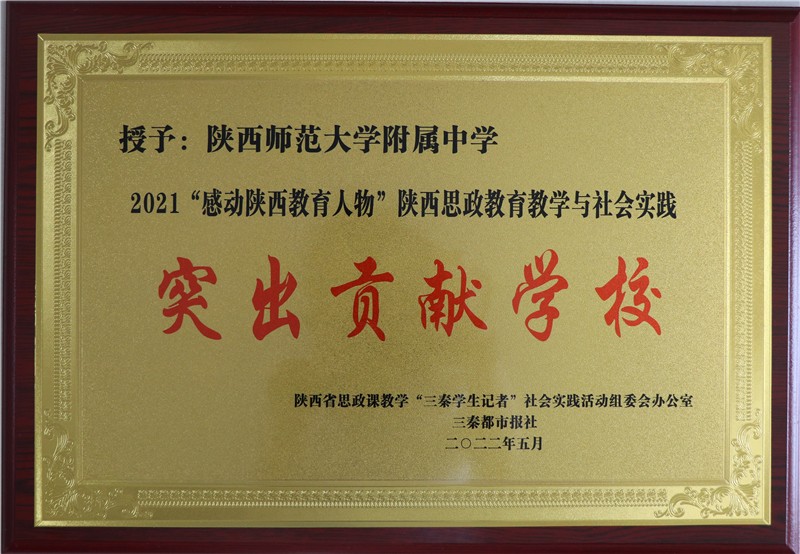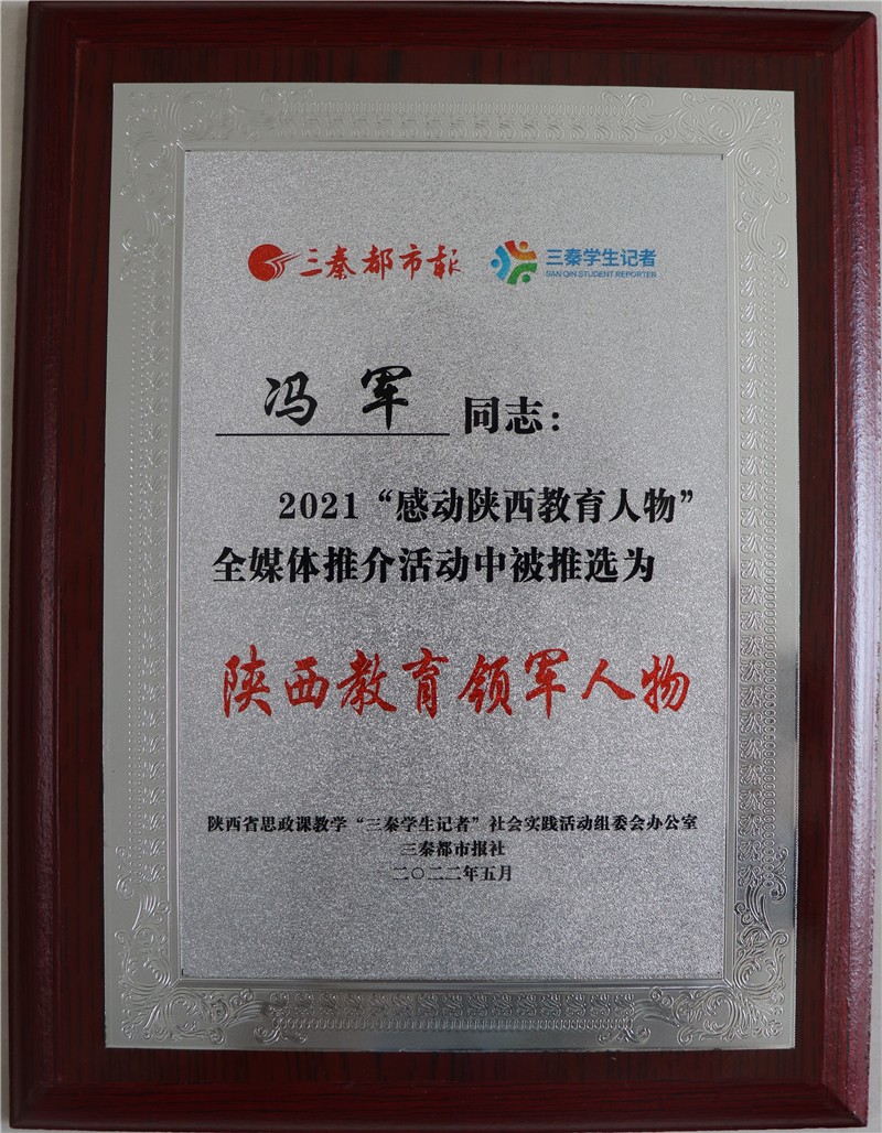 2022年5月,我校在陕西省思政课教学“三秦学生记者”社会实践活动组委会办公室、三秦都市报社举办的2021“感动陕西教育人物”全媒体推介活动中,荣获“改革创新力名校+共同体”“群众满意的教育质量示范中学”“陕西思政教育教学与社会实践突出贡献学校”,我校冯军同志荣获“陕西教育领军人物”。