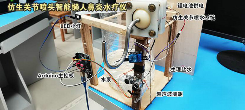 由张晨曦同学创作的一等奖作品《仿生关节喷头智能鼻炎水疗仪》,利用超声波传感器感知人体与仪器的距离,改变水流大小,泵机自动喷出生理水,使用仿生关节喷水头调节角度,全程几乎无需手动操作。