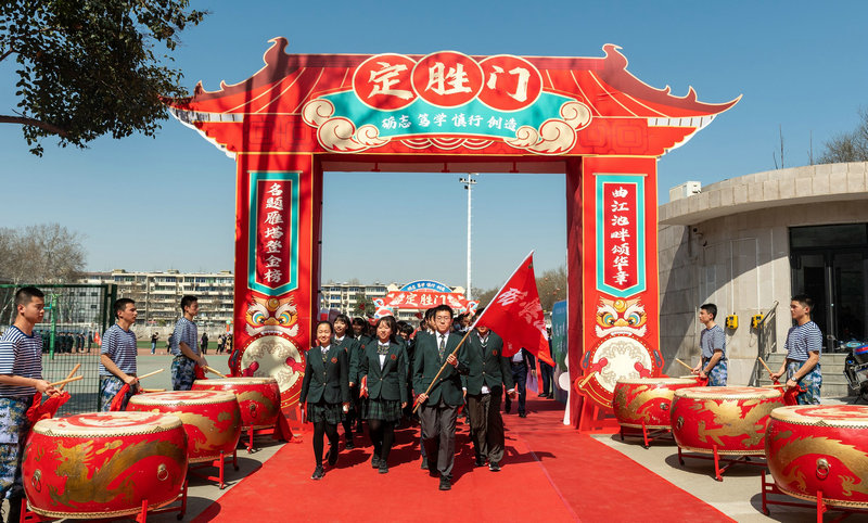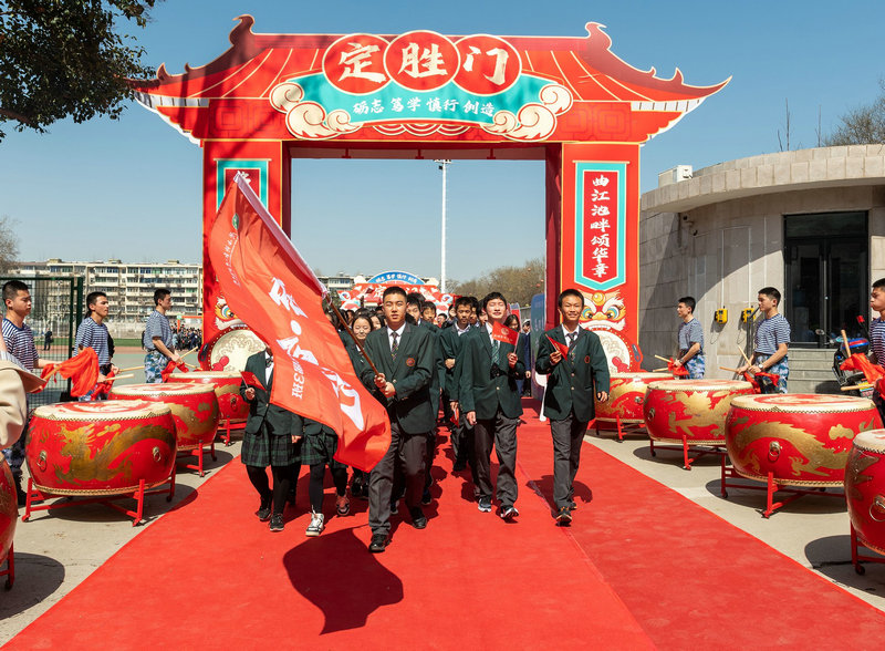 初2023届的同学们精神抖擞,身着正装,在家长、老师的陪同下,以班级为单位踏上红毯,挥舞班旗,走过“定胜门”。在斗志昂扬的鼓声中,向100天后的自己许下诺言,将心愿卡满怀希望地贴在许愿墙上,祝愿2023年中考旗开得胜。