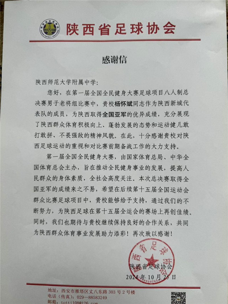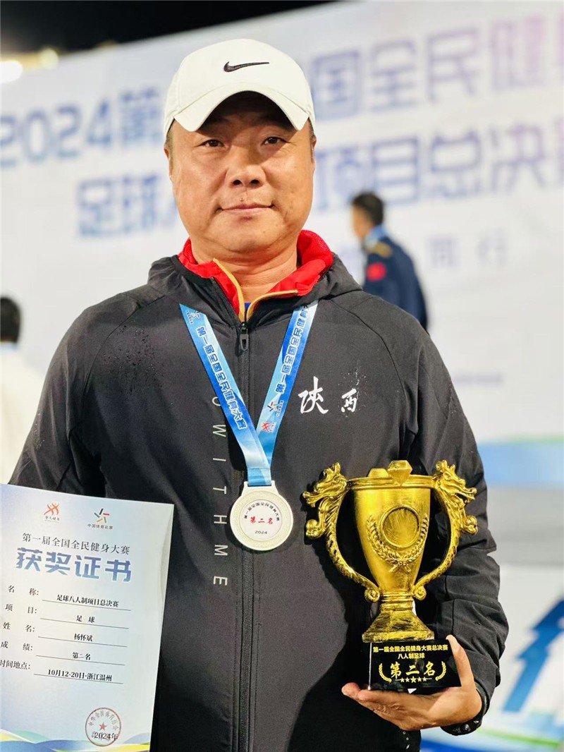 10月19日,第一届全国全民健身大赛八人制足球总决赛在温州体育中心体育场进行,共有来自全国13个省、自治区、直辖市的16支球队齐聚温州参加此次比赛。我校杨怀斌老师作为陕西新城代表队一员参赛。参赛以来,陕西队一路披荆斩棘,经过小组赛、交叉赛、总决赛,最终荣获总决赛男子老将组第二名。