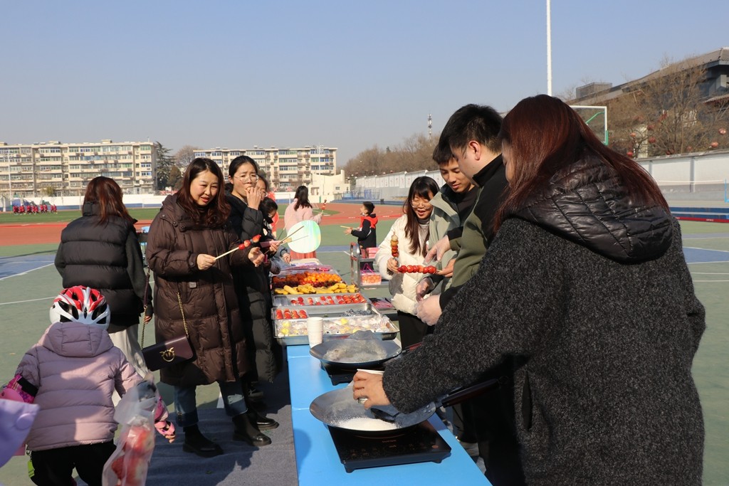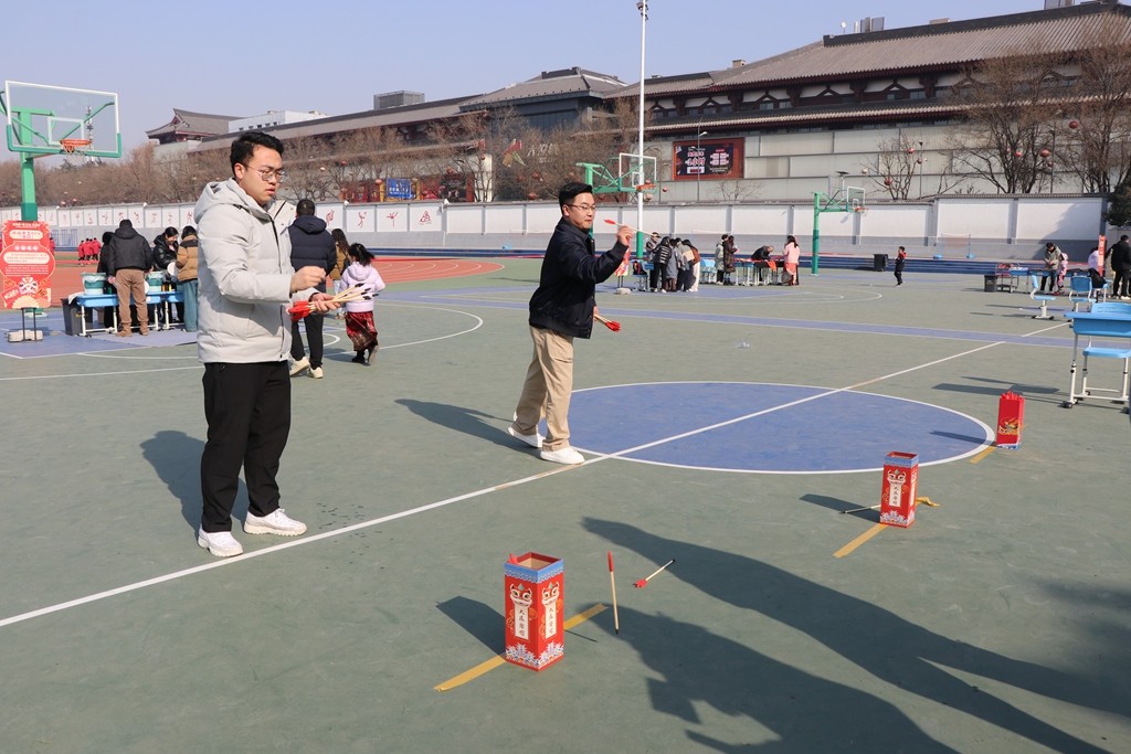 在制作冰糖葫芦体验区,教职工们亲手挑选山楂、串果、裹糖,制作出了一串串晶莹剔透、美味可口的冰糖葫芦。这一传统小吃的制作过程不仅让大家体验到了动手的乐趣,更让大家在品味美食的同时,对传统文化有了更深刻的认识和理解。此外,投壶游戏、传统文化知识竞答、传统射箭(礼射)、非遗手工DIY、抖空竹比赛、蹴鞠比赛以及掷沙包比赛等项目也各具特色,教职工们在参与中感受到了传统文化的多样性和独特韵味。
