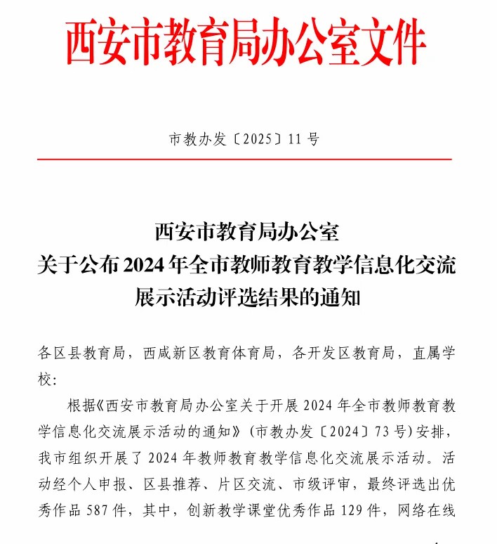 2025年1月9日,西安市教育局发布《关于公布2024年全市教师教育教学信息化交流展示活动评选结果的通知》,我校陈凡、孟宏哲、刘杨三位老师的创新课堂教学课例“消化和吸收”荣获创新作品奖(一等奖);杨璐璇老师基础教育精品课案例“物体的浮与沉”荣获创新作品(一等奖);任荣贞老师基础教育精品课案例“分子结构与性质全章复习——探秘生命之源”荣获创新作品(一等奖);牛乐老师基础教育精品课案例“二项分布和超几何分布”荣获创新作品(一等奖);陈沙老师创新课堂课例“氧化还原反应”荣获示范作品(二等奖);刘怡娴、孟宏哲老师基础教育精品课案例“群落的结构(第二课时)”荣获入围作品(三等奖);庞欣蕊老师基础教育精品课案例“黄土高原”荣获入围作品(三等奖)。