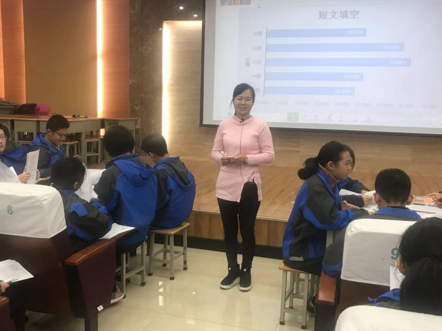 研讨会的第二节课,来自本部初三年级的姚菊香老师带领本部初三十班的孩子们给大家带来了一堂别开生面的完成句子和短文填空讲评课。课上,姚老师分析了近三年中考完成句子和短文填空的考查范围,以数据为基础,带领孩子们解决了自己在完成句子和短文填空中出现的问题并且教会了孩子解决问题的方法。姚老师还鼓励孩子们要多思考,多阅读。姚老师风趣幽默,课堂气氛活跃,得到了与会老师的好评。