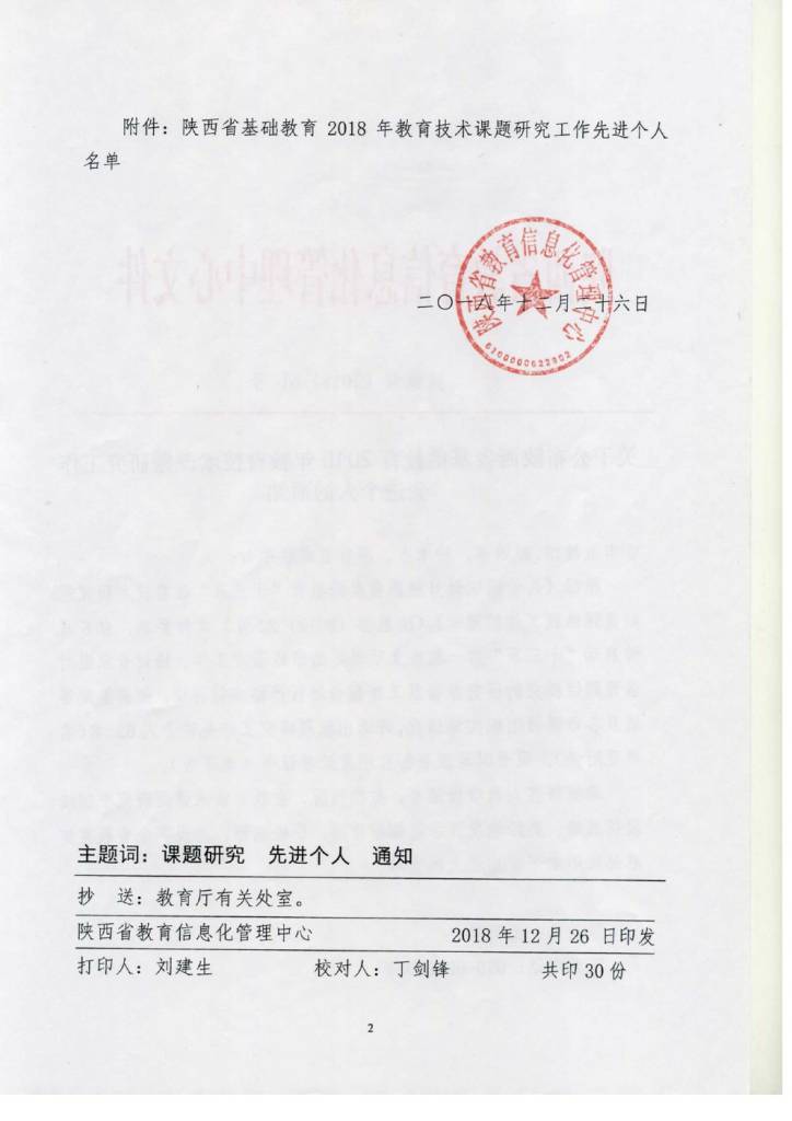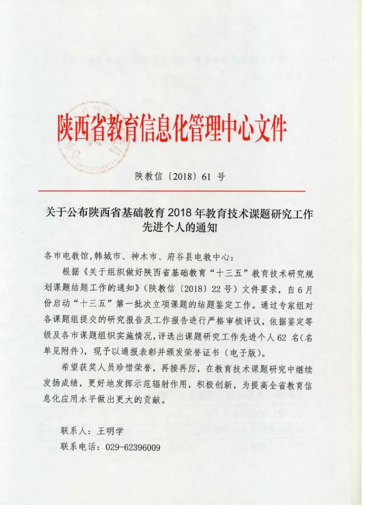 马立老师荣获陕西省2018年教育技术课题研究工作先进个人