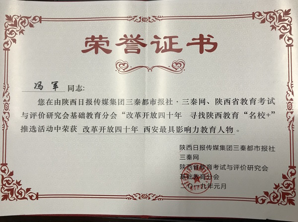 冯军校长荣获“改革开放四十年 西安最具影响力教育人物”荣誉证书