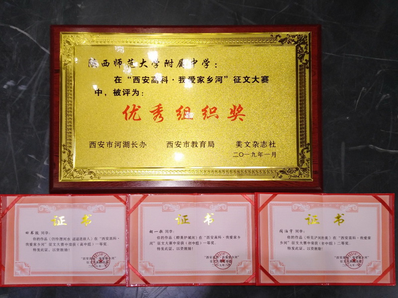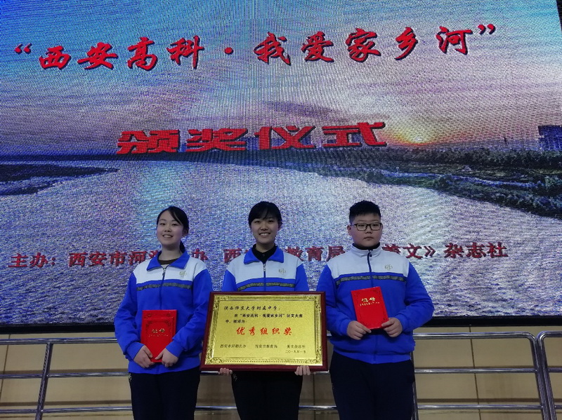 2019年1月26日下午,由西安市河湖长办、西安市教育局、《美文》杂志社共同举办的“西安高科.我爱家乡河”征文大赛在高新区举行颁奖仪式,我校在本次比赛中取得优异成绩。其中,我校荣获“优秀组织奖”,田书殷同学以《仍怜渭河水·迢迢送故人》获得高中组一等奖,胡一歌同学所写《醉美护城河》荣获初中组一等奖,阎泊宇同学所作《听见浐河的美》荣获初中组二等奖。