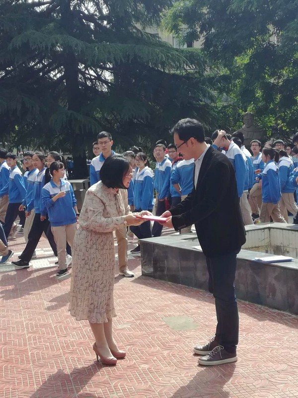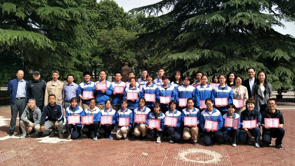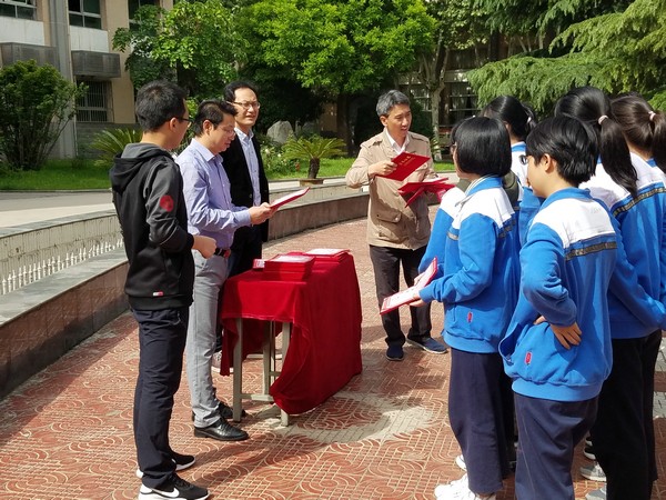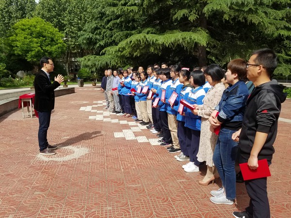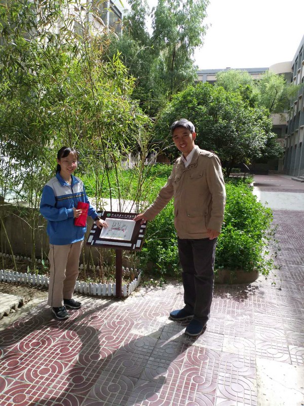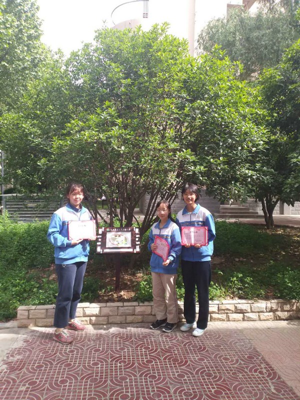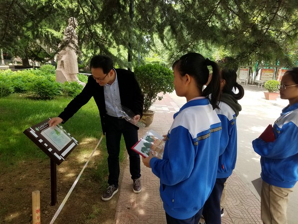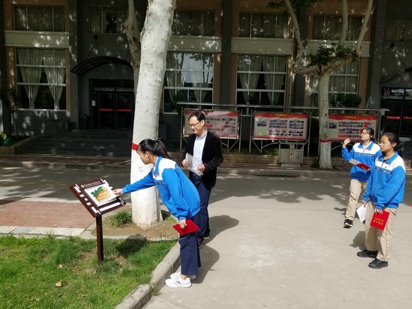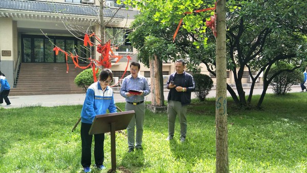 2019年4月30日,总务处组织树牌设计的指导老师、高一年级师家庆老师、初一年级王芳老师、获奖同学,举行树木挂牌仪式并合影留念。